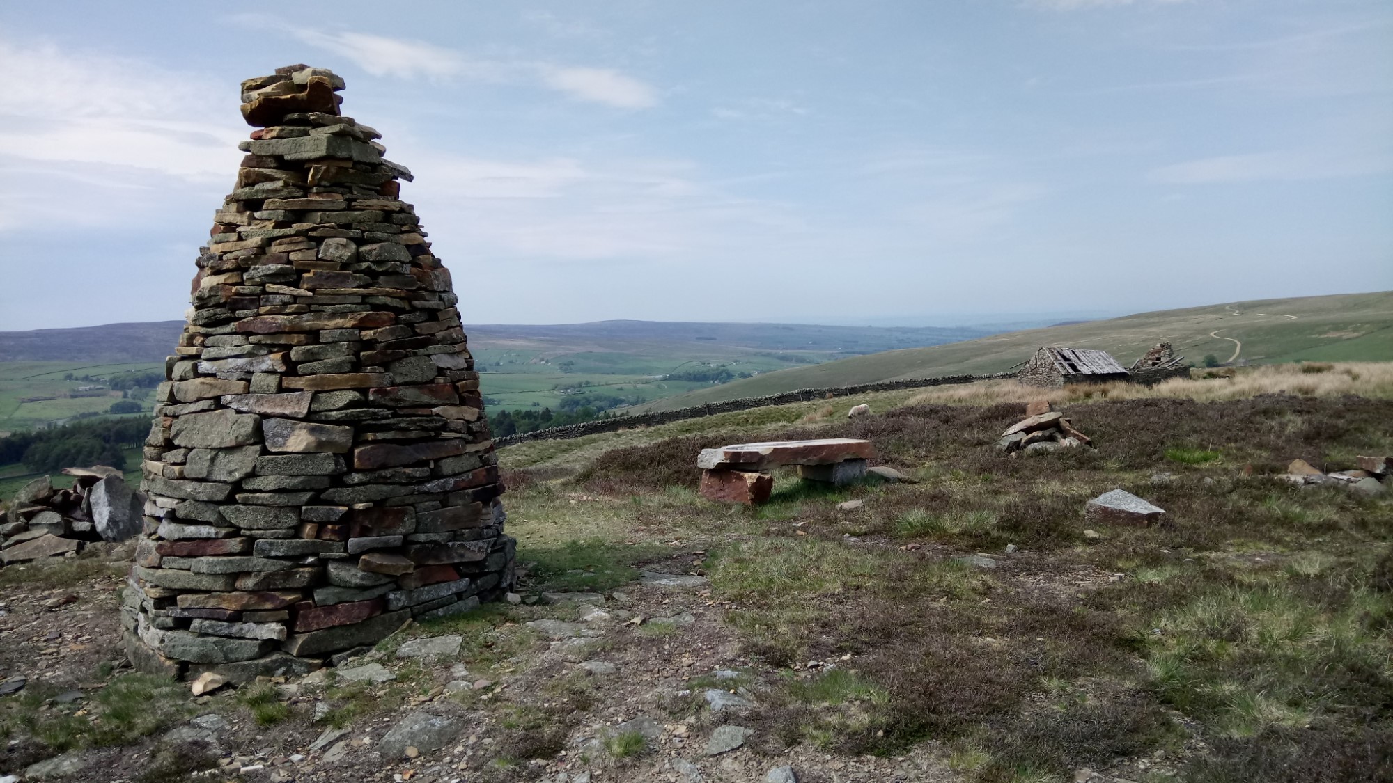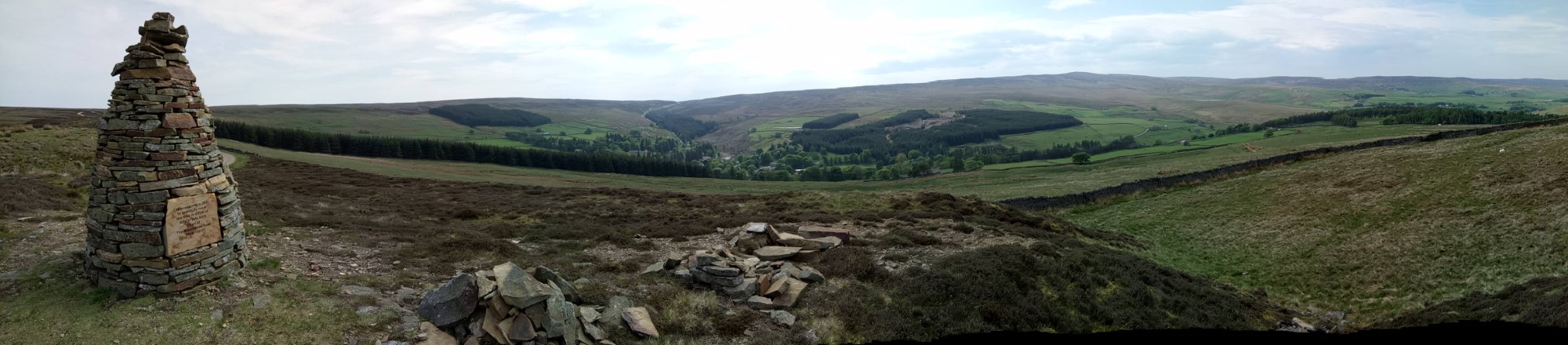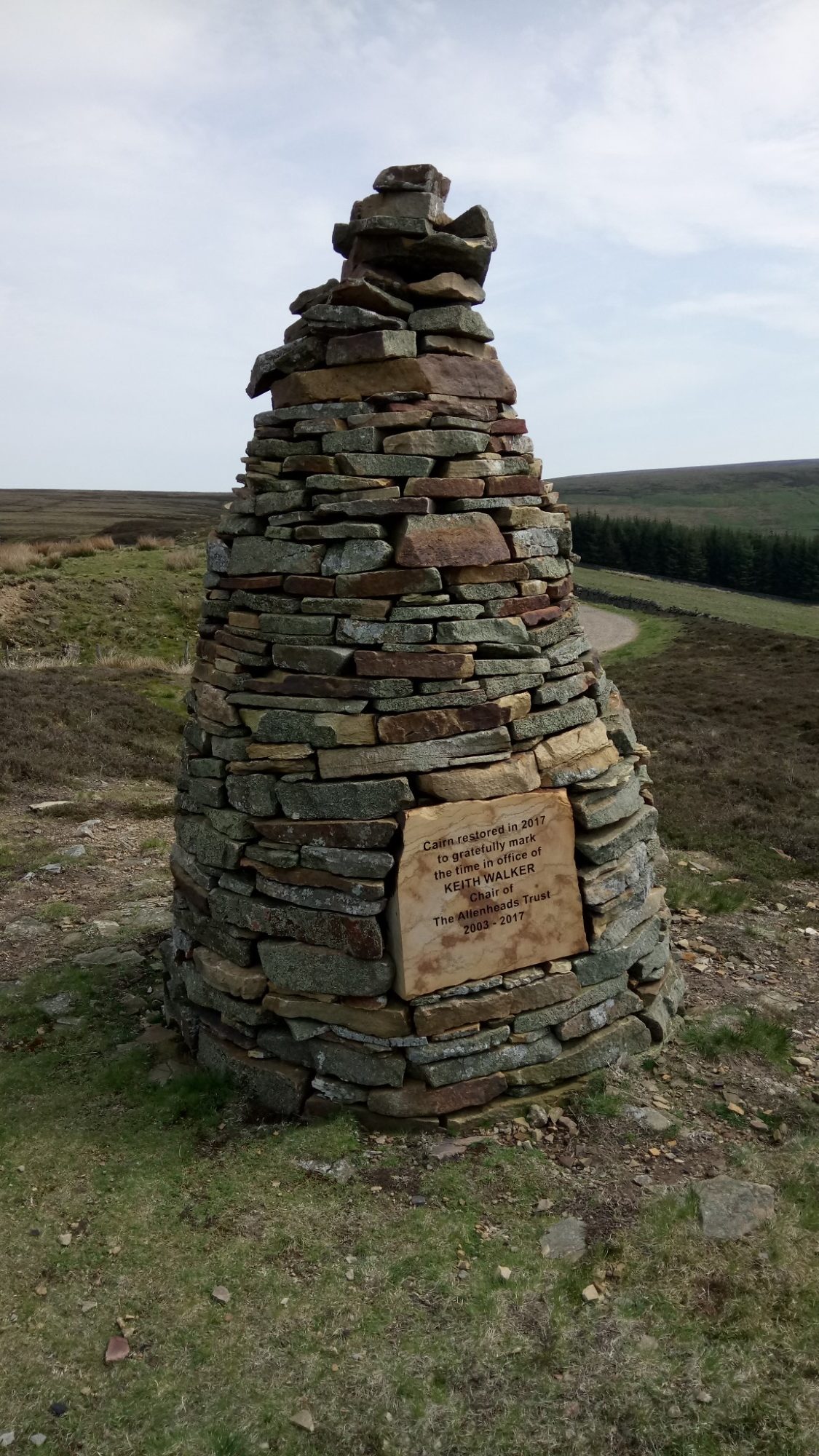 Once onto the track and away from the road, the walking is much easier. The views over the valley are spectacular. We soon passed an interesting cairn. It was constructed in 2017 as a monument to the memory of a long standing Chairman of the Allenheads Trust. There is also a stone seat here to contemplate life while admiring the view.