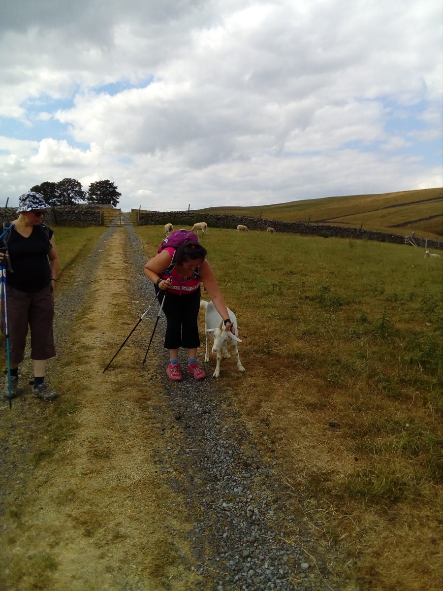 On the way back to Bowlees we passed plenty of the local farm animals, cows, a few bulls, aswell as plenty of ewes and tups. More unusually we met a goat. This one took a shine to Anne, one of our walkers. It followed her right along the edge of a field, but got bored when we got to the gate and wandered off.