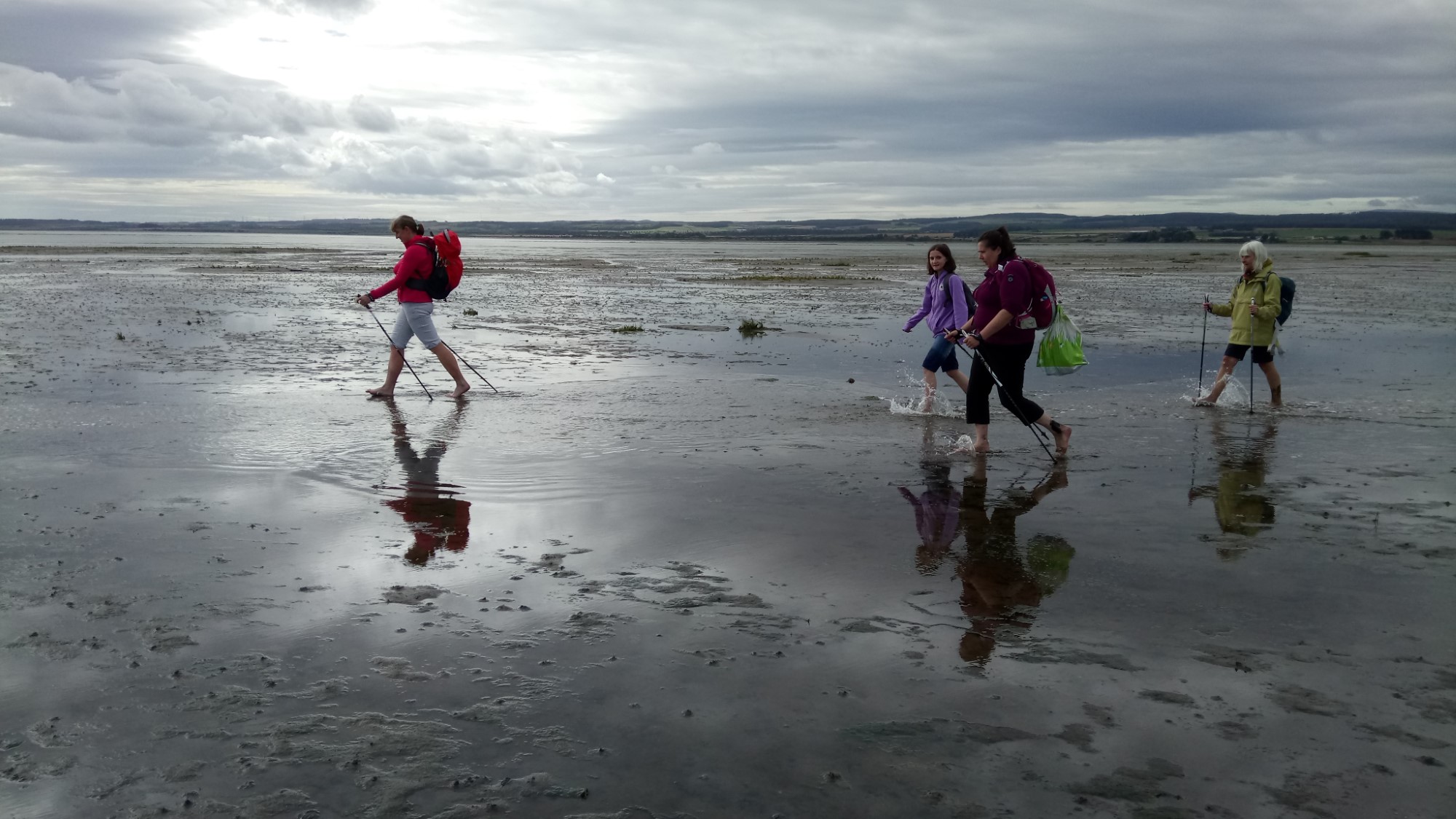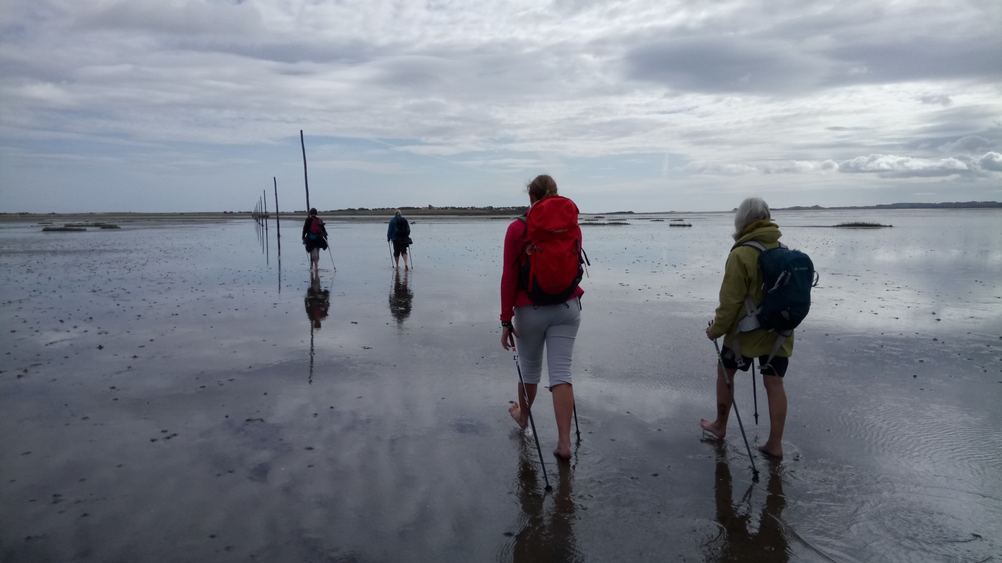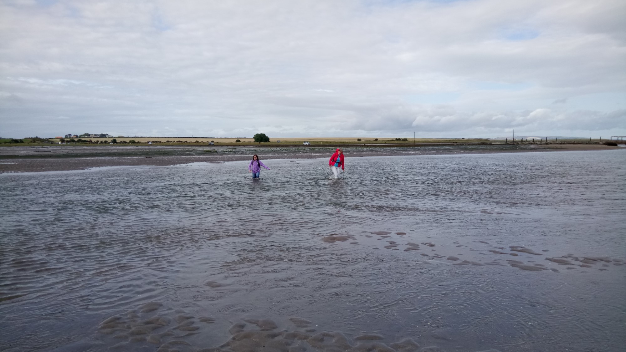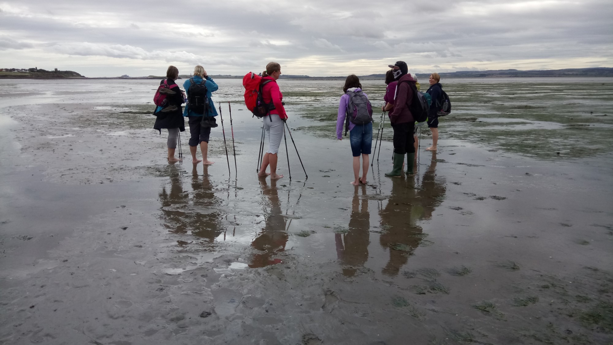 Fully fed and watered, we left our cars at the Barn at Beal (with their permission) and took the footpath to the start of the causeway. We were crossing soon after the tide had gone out, so the water was higher than on the previous crossing. So, we split and most went over the bridge by the refuge. However, Julie, Martin, Chris and Annabelle went through the channel. It was thigh deep and pretty cold but tremendous fun, to start the crossing.