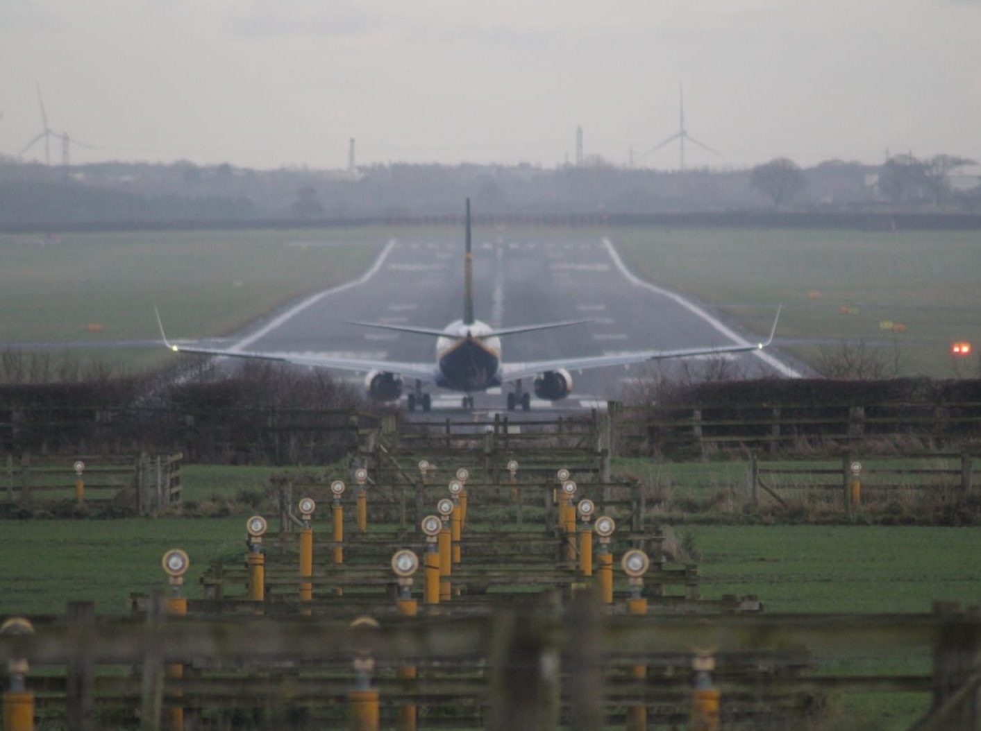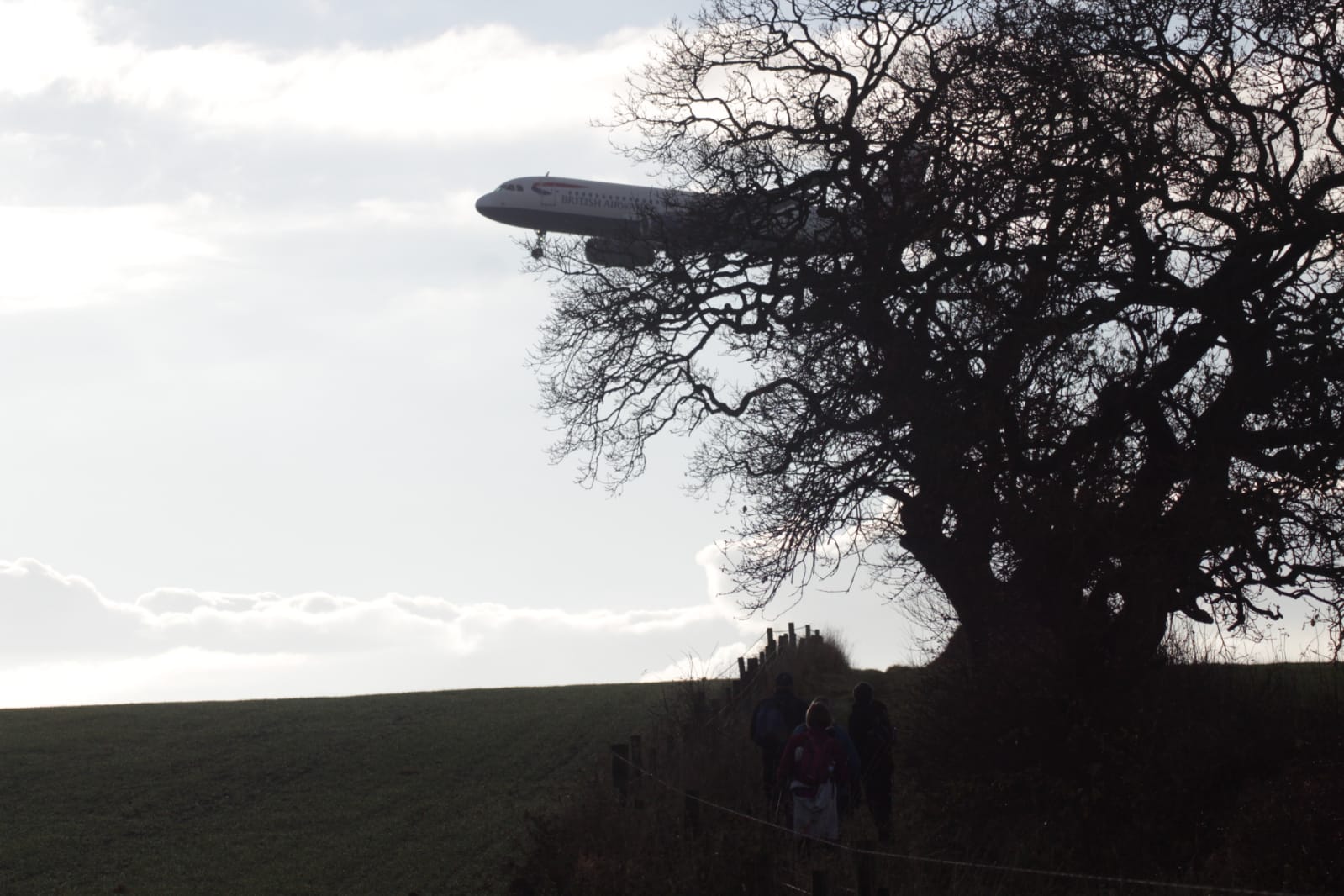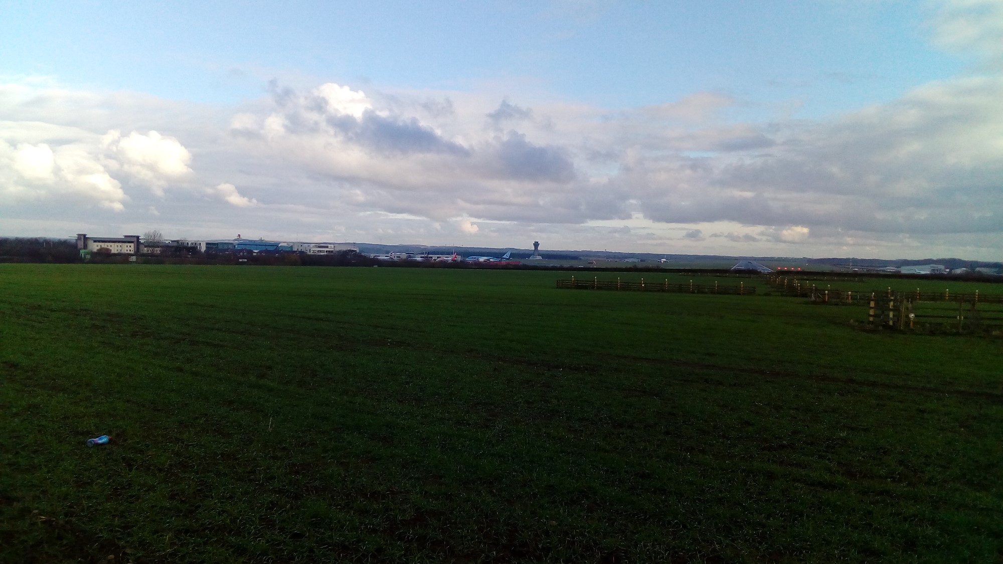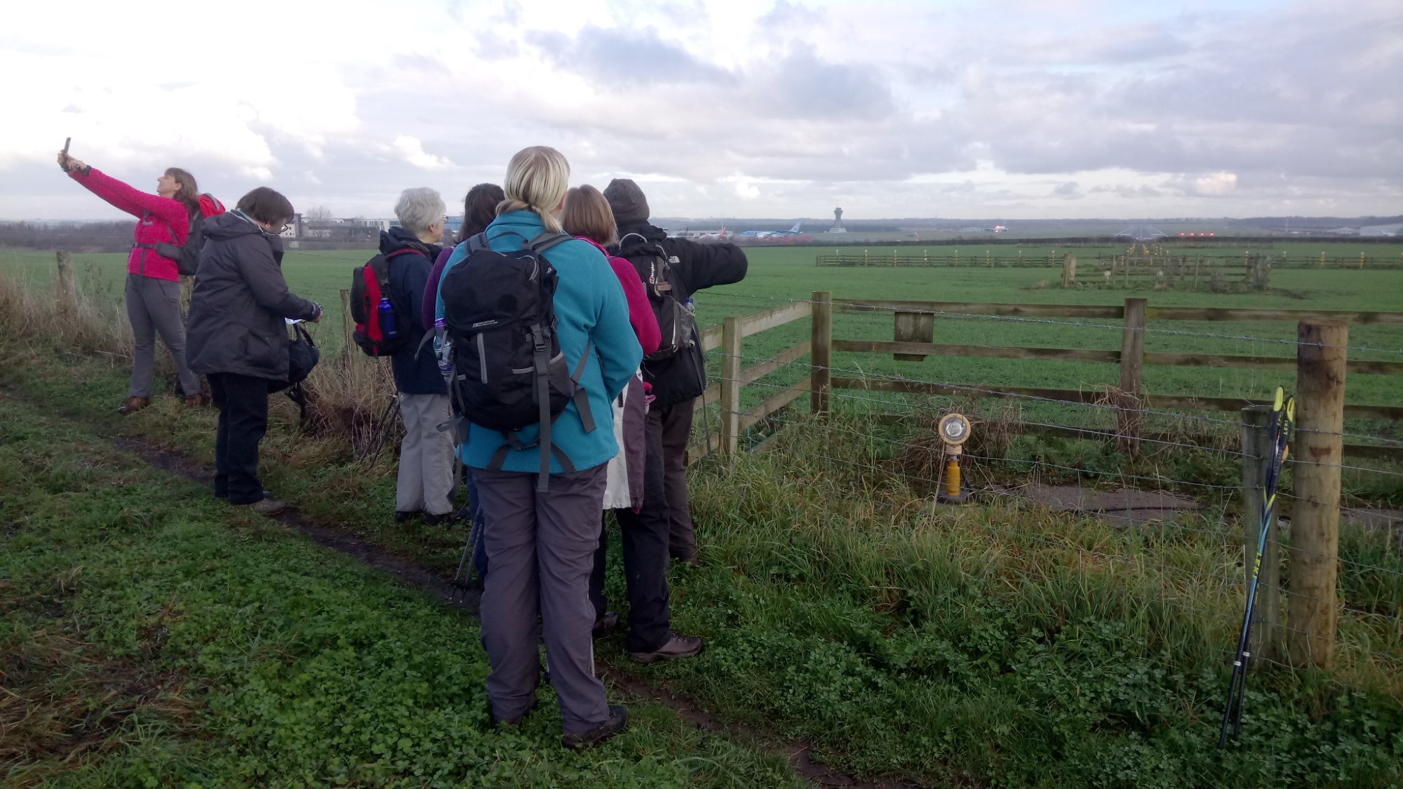 A track leads from the old pit site alongside the A696. This path rises up into a field and passes the outer reaches of the runway lights. We stopped here for Geoff to explain how the airport operated (He used to work with Dan Air and then became an air traffic controller). As a bonus Geoff arranged for the Emirates flight from Dubai to come in as we stood there. This is a Boeing 777 and is one of the biggest aircraft operating from Newcastle.