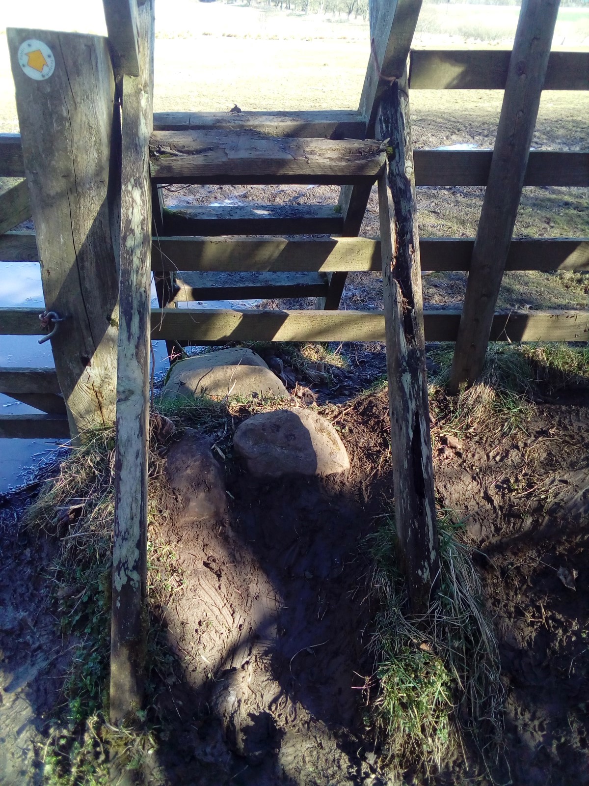 First up was a short distance along the road. A finger post pointed us off the road and across a field of sheep. We got to a ladder stile which posed a slight problem as it didn’t have any rungs on one side. I went over the stile but Anne climbed over the fence next to it as there was a really deep puddle at the gate.