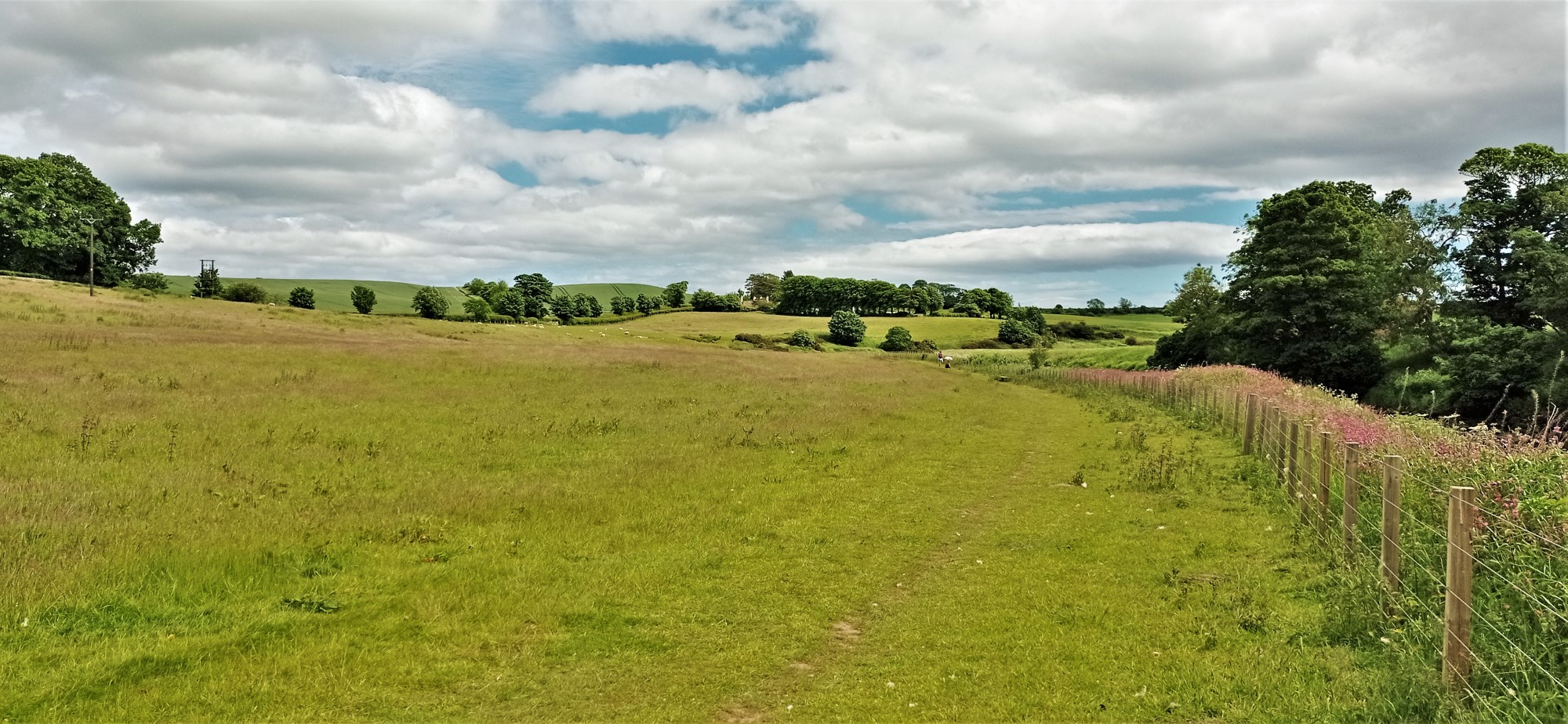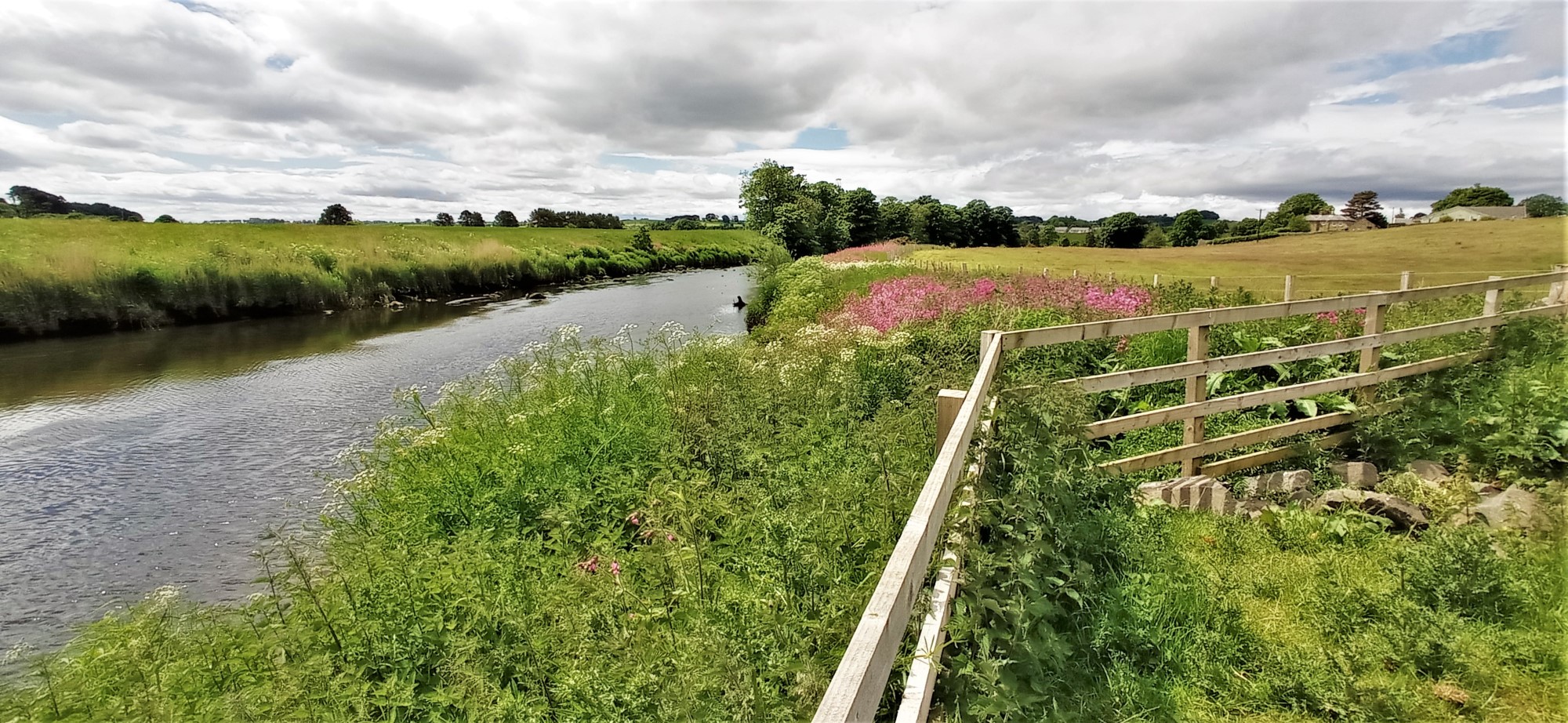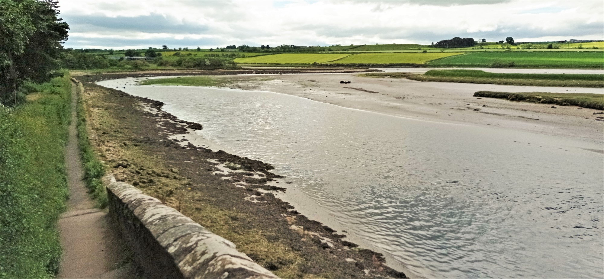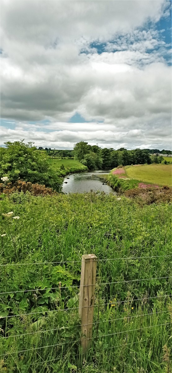 We cross the river Aln and make our way past the Cricket Club and towards Lesbury. However we don’t actually reach Lesbury. Instead, after crossing the river Aln again, we turn right along the river and through a few fields, some of which have crops in them.