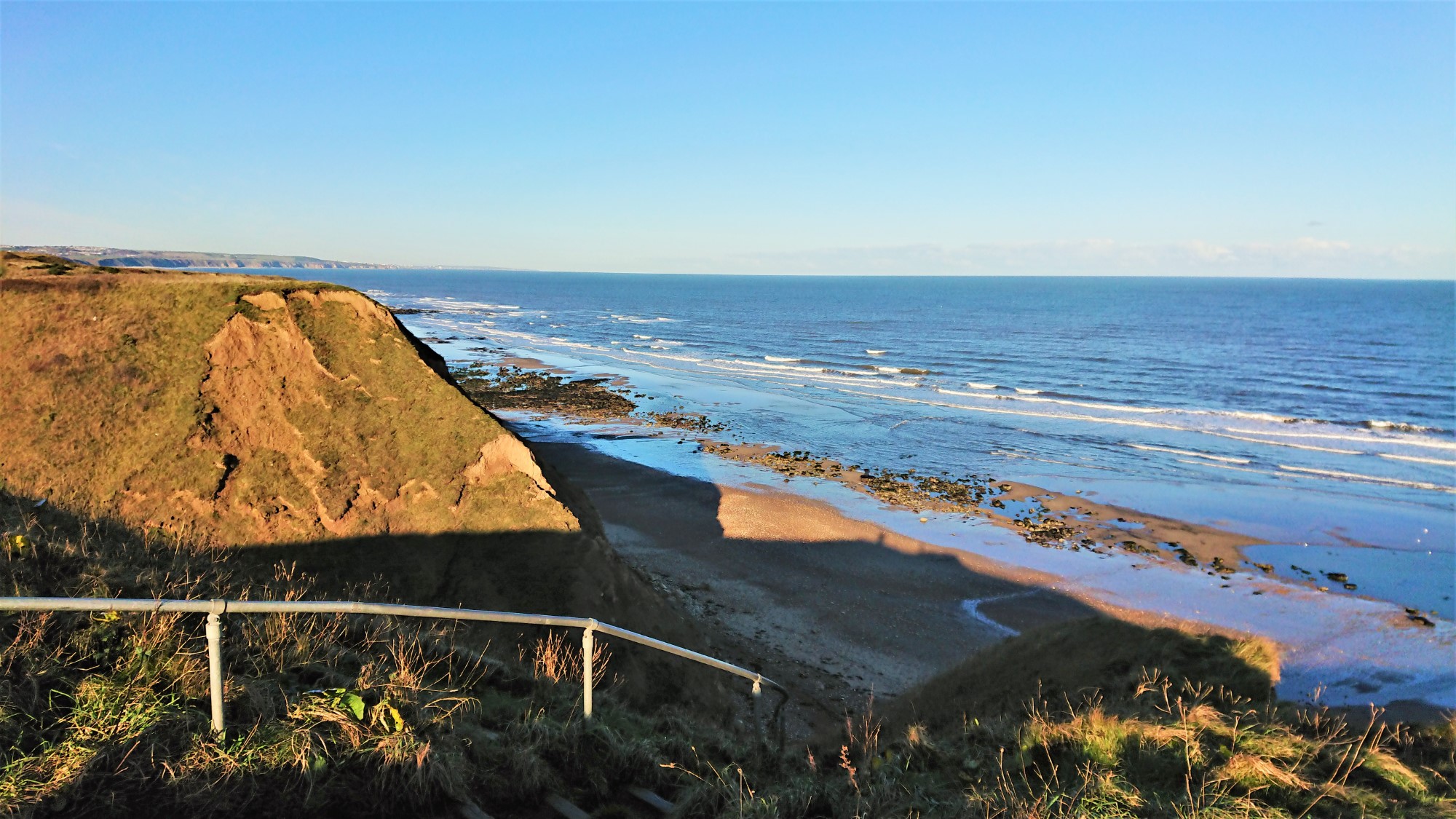 We cross a bridge over the railway line and continue towards the coast. If the tides are right, we will get onto the beach and avoid some of the holiday park, before returning to the clifftop.