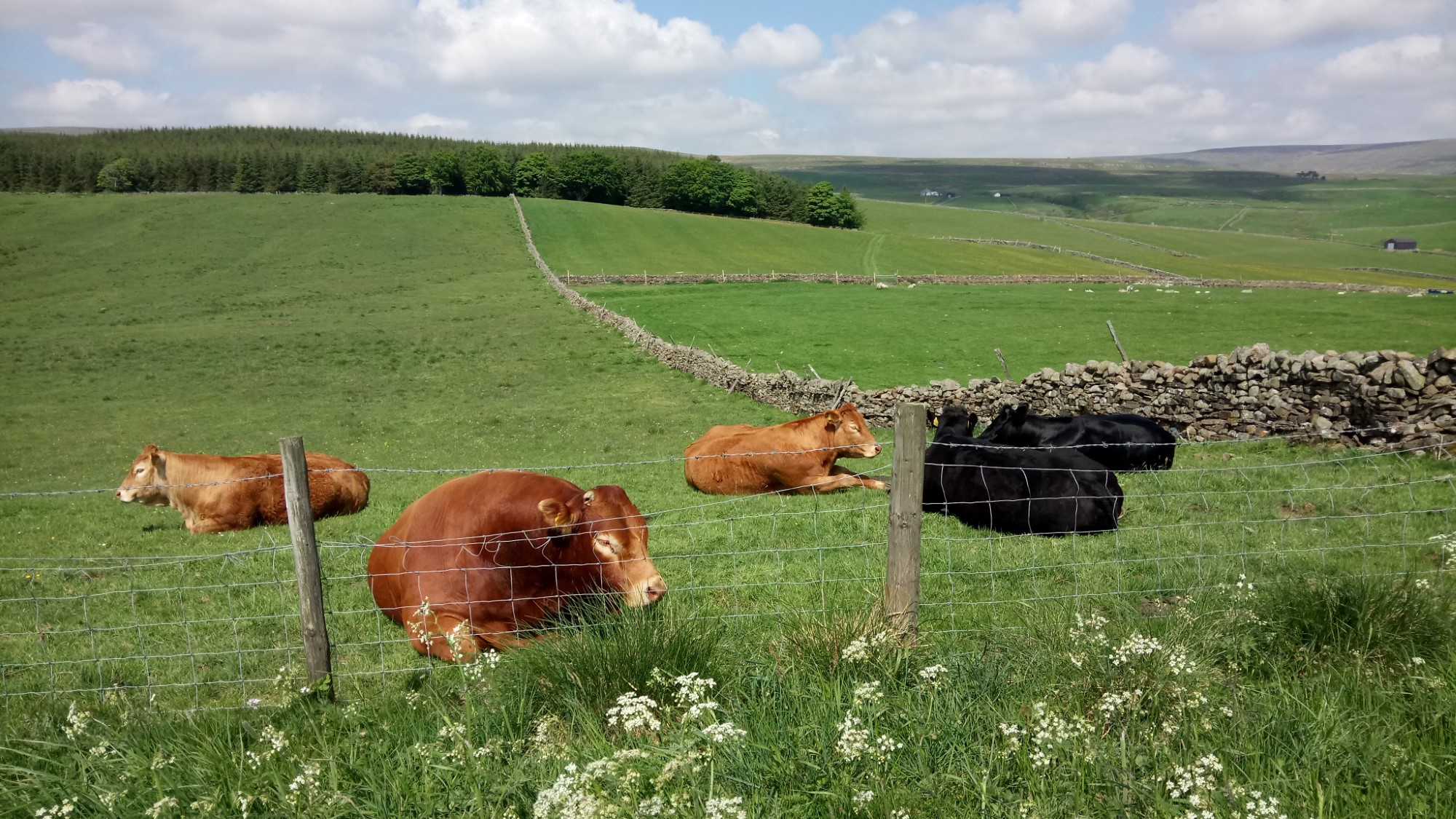 We cross the Tees just below the confluence with Harwood Beck. The land is flat at this point and the fields are green and lush. Sheep and cattle share their fields with large numbers of Lapwings. In this area you’d be surprised that the Lapwing is on the RSPB Red List.