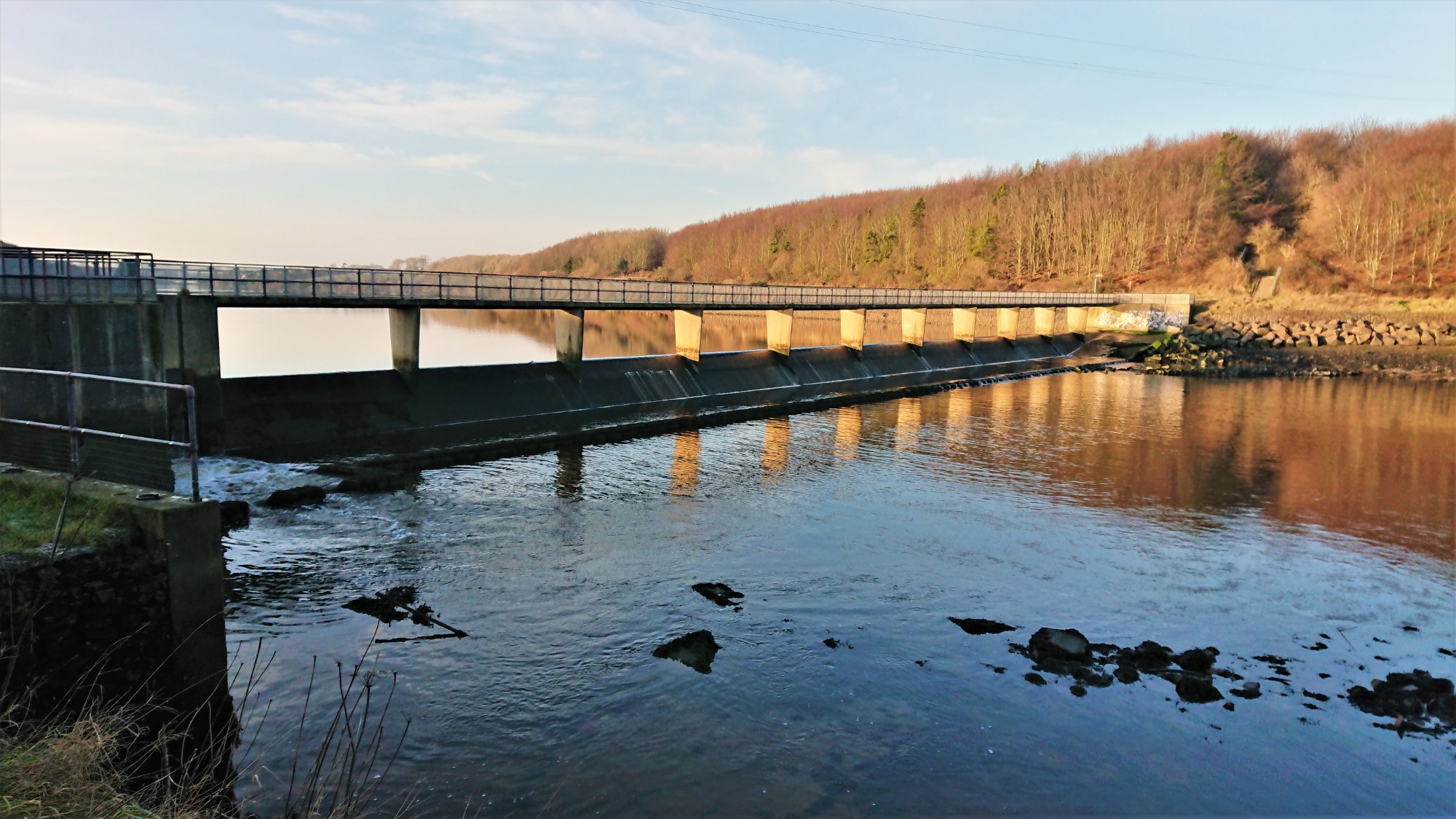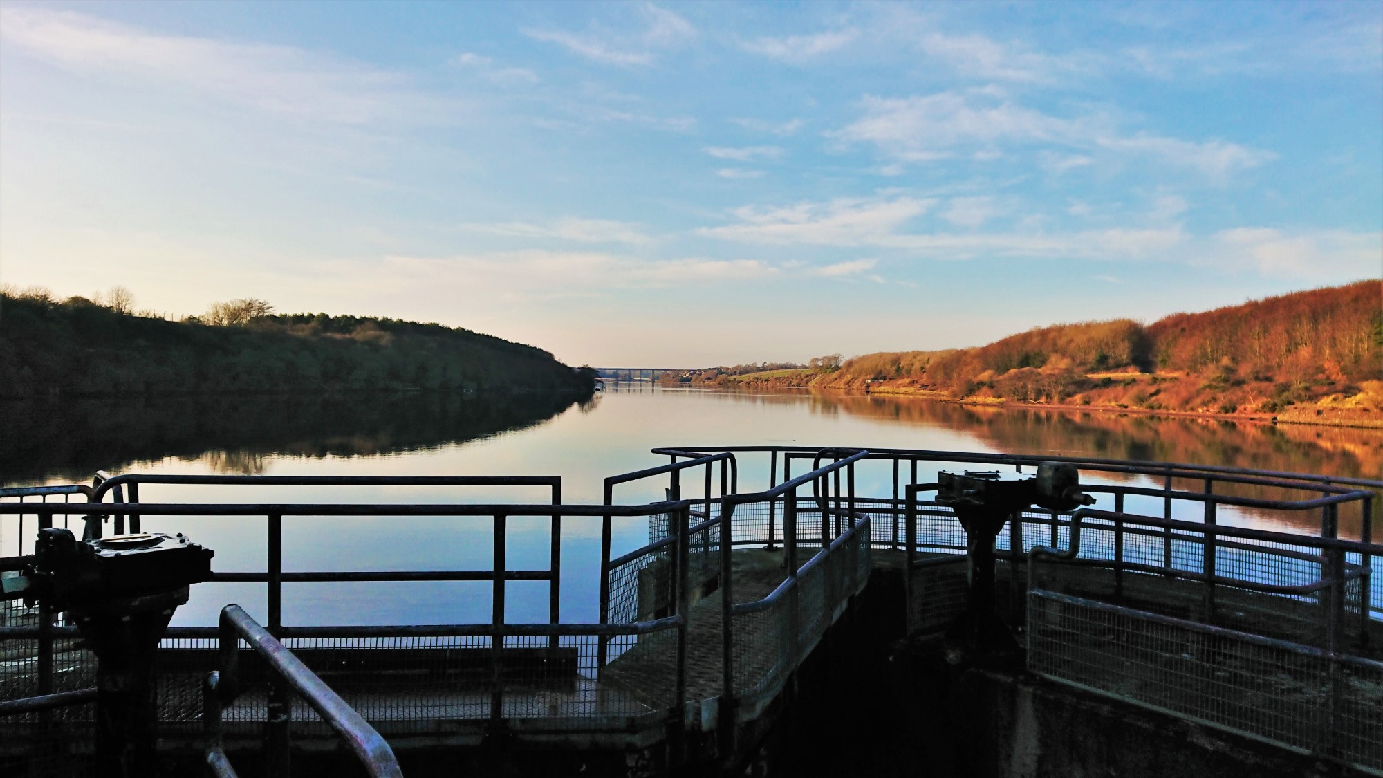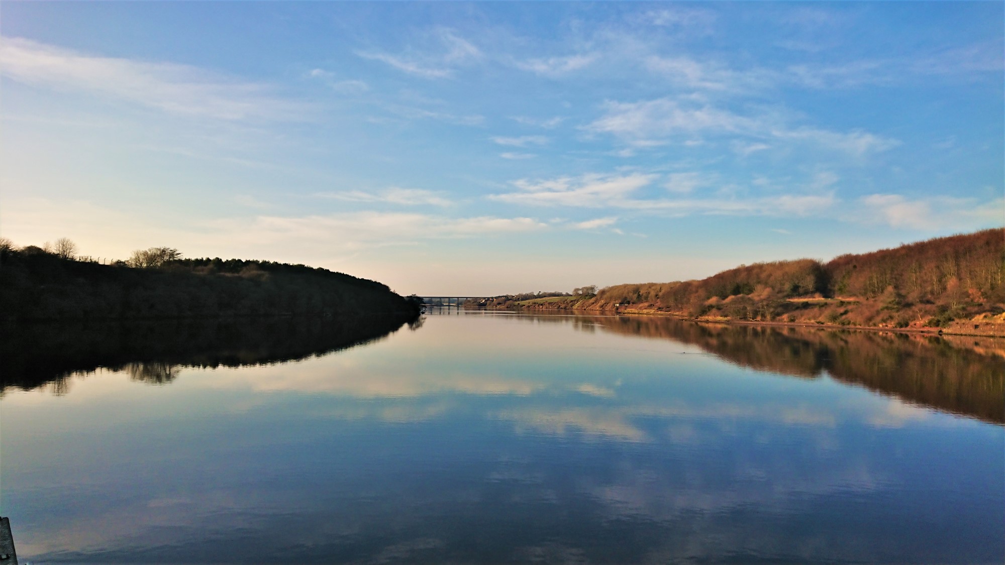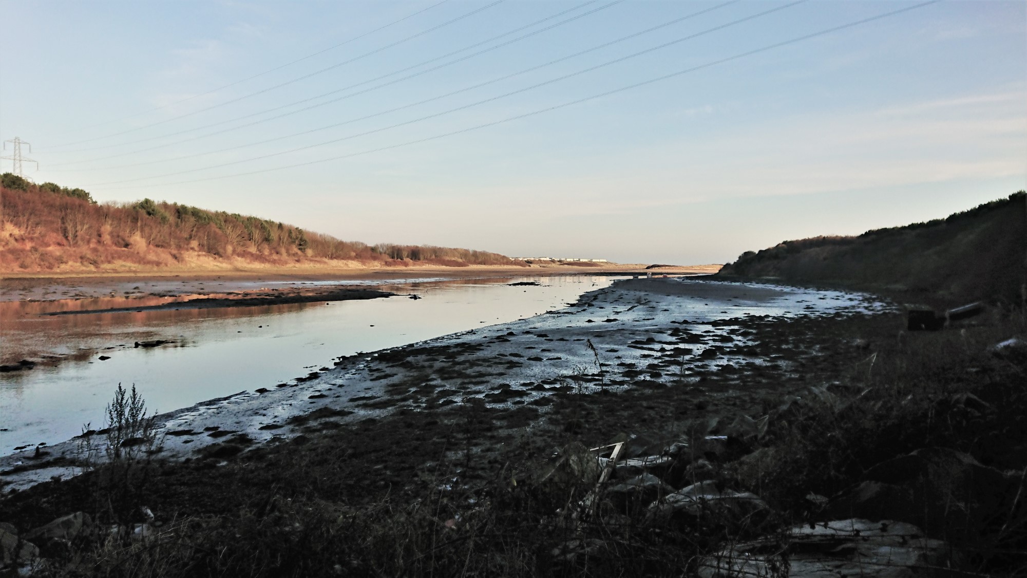 We follow the coast South until we reach the Wansbeck river. Here we turn inland and follow the river upstream to the weir. There is a bridge over the weir, which now carries the England Coast Path to Cambois.