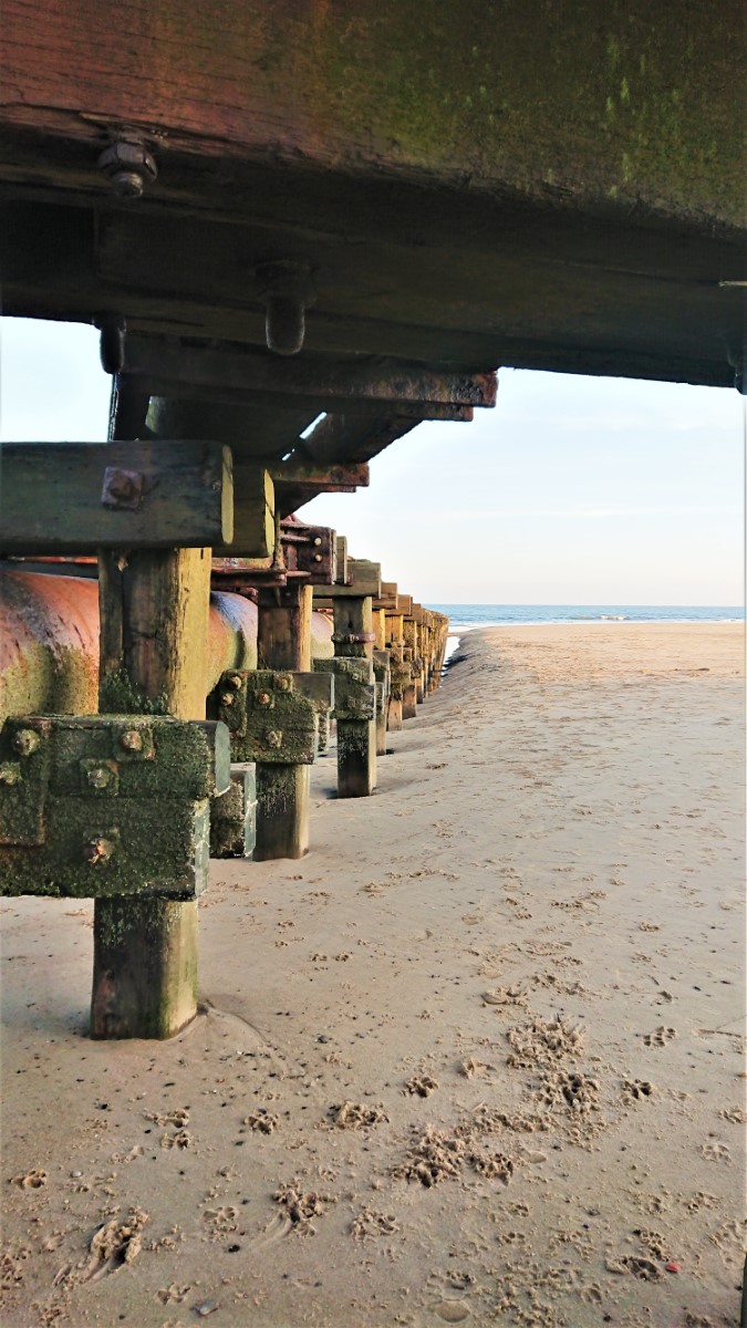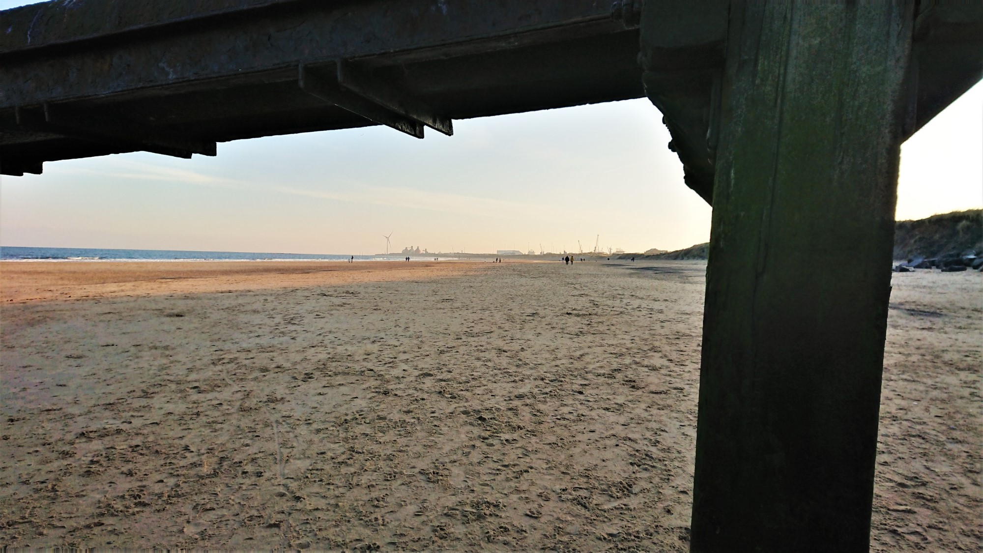 Heading downstream we eventually arrive at Cambois beach. We will drop onto the beach, if possible, and follow it down the coast for a little way. We will pass under an old outlet pipe. This was the hot water outlet from Blyth Power station, but it is now disused.