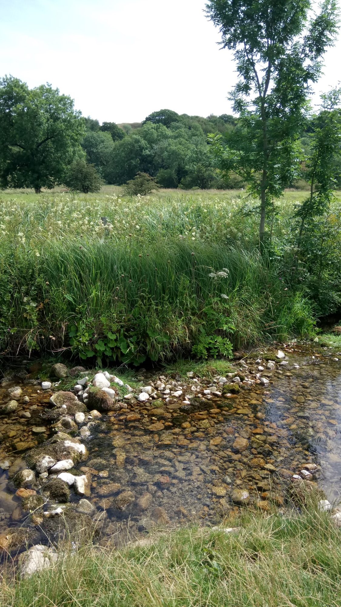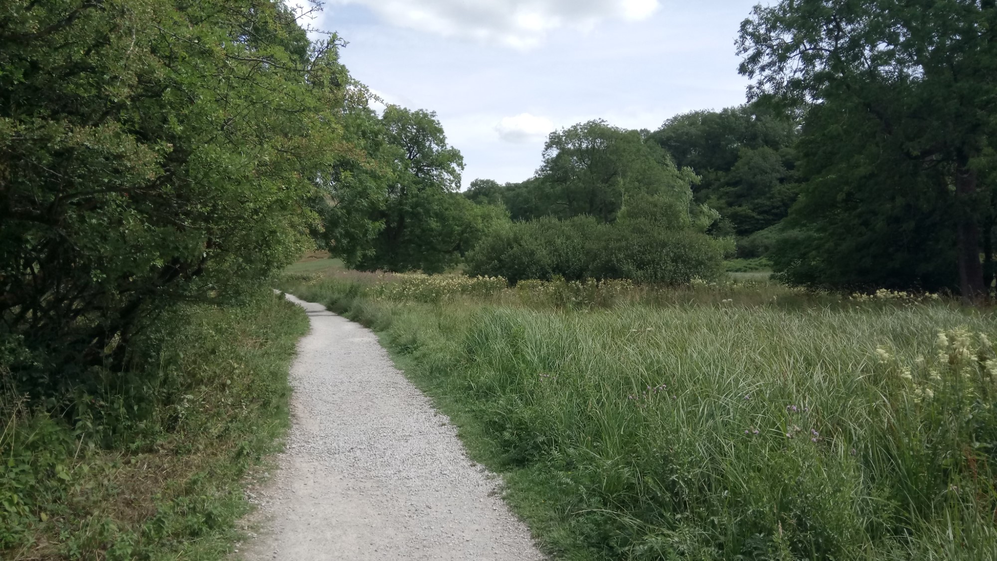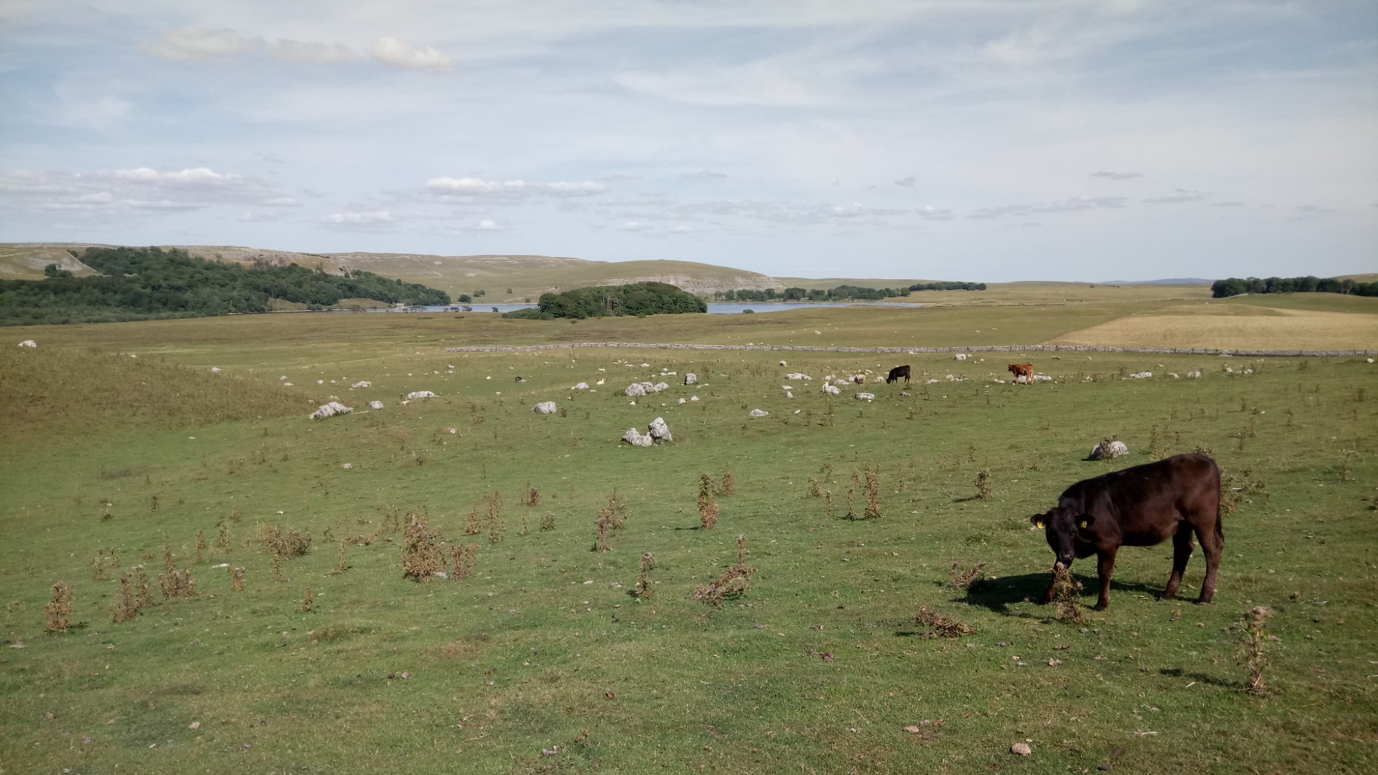 We took the “Dales High Way” towards Malham Cove but turned off towards Malham Tarn. After a long but mostly flat walk we reached the far end of the Tarn. Walking up to the Field Centre at Malham Tarn House, we spotted huge swathes of raspberry bushes, shaded by trees. The ripe fruit tasted fresh and sweet. Further along we found a view point with a seat. Lunchtime.