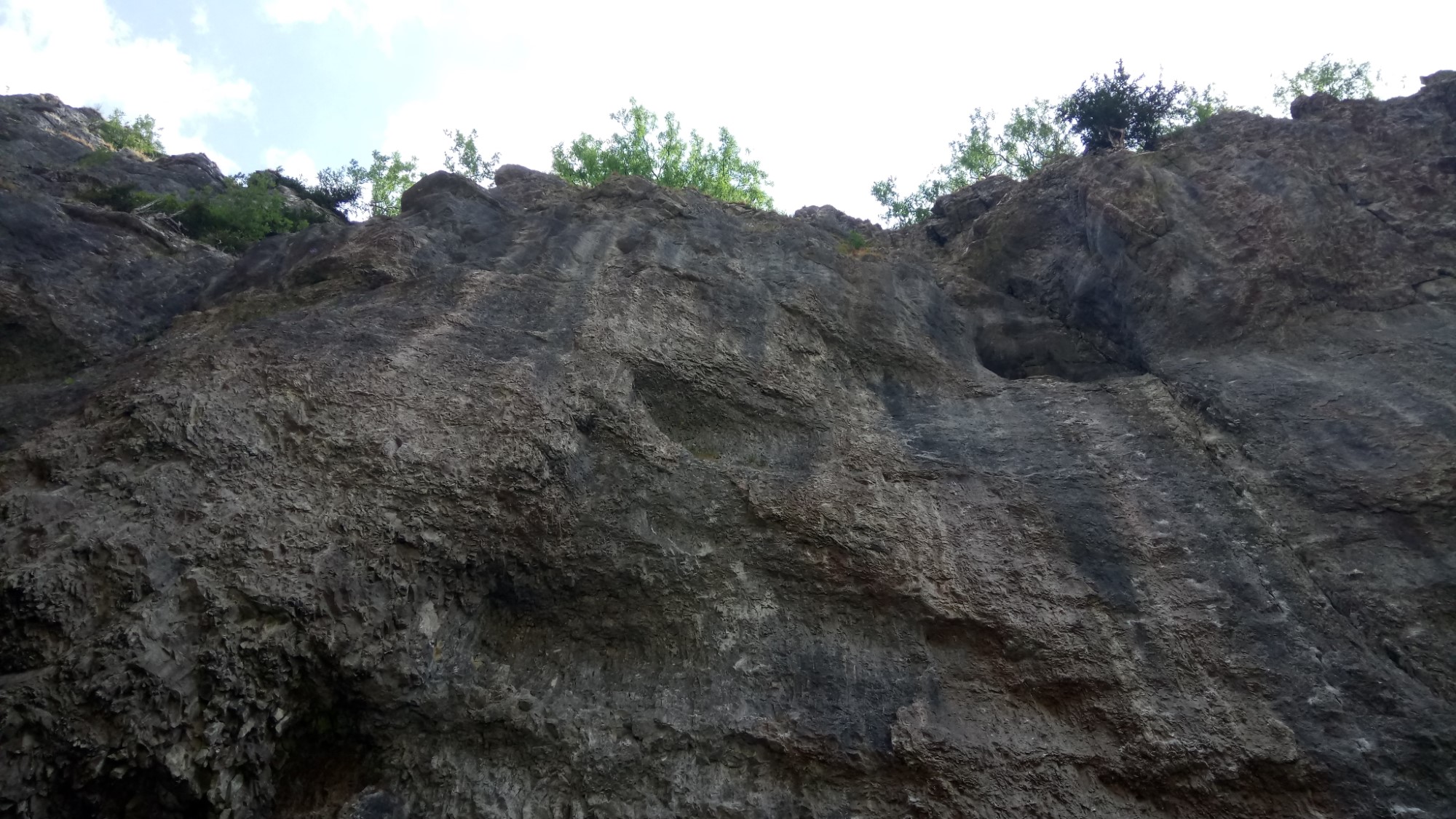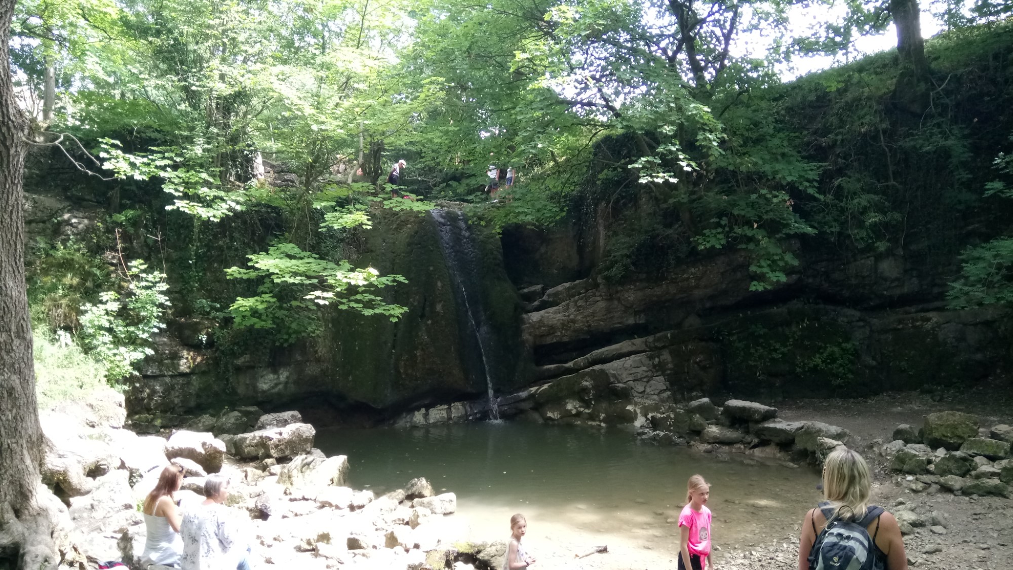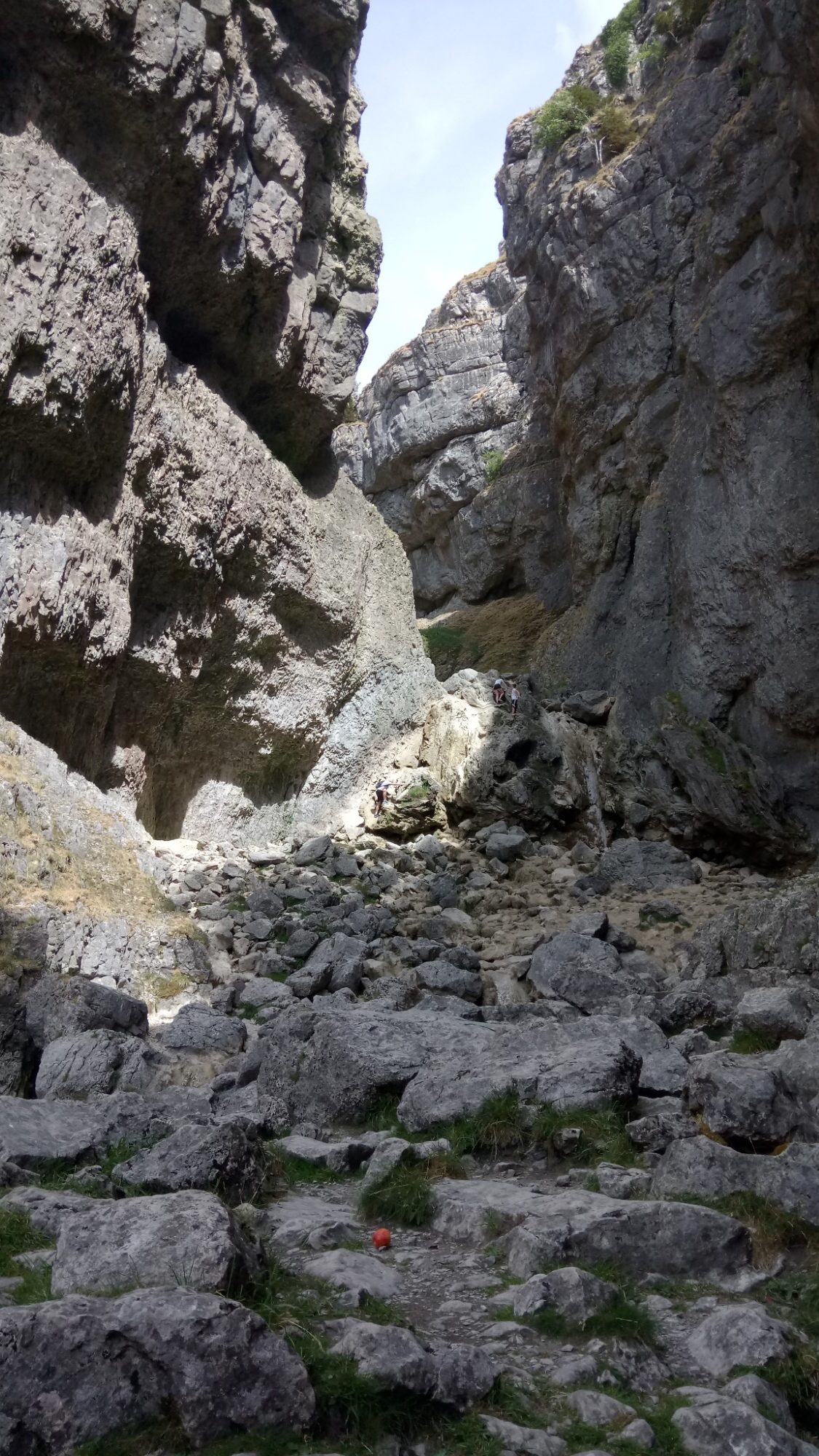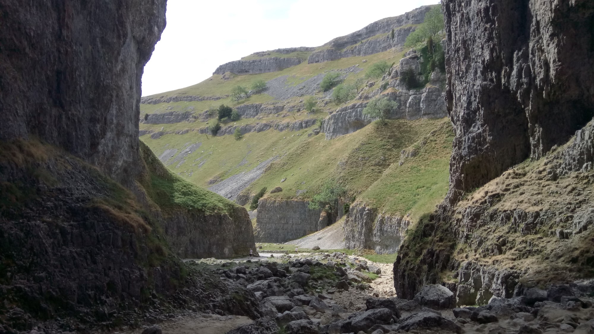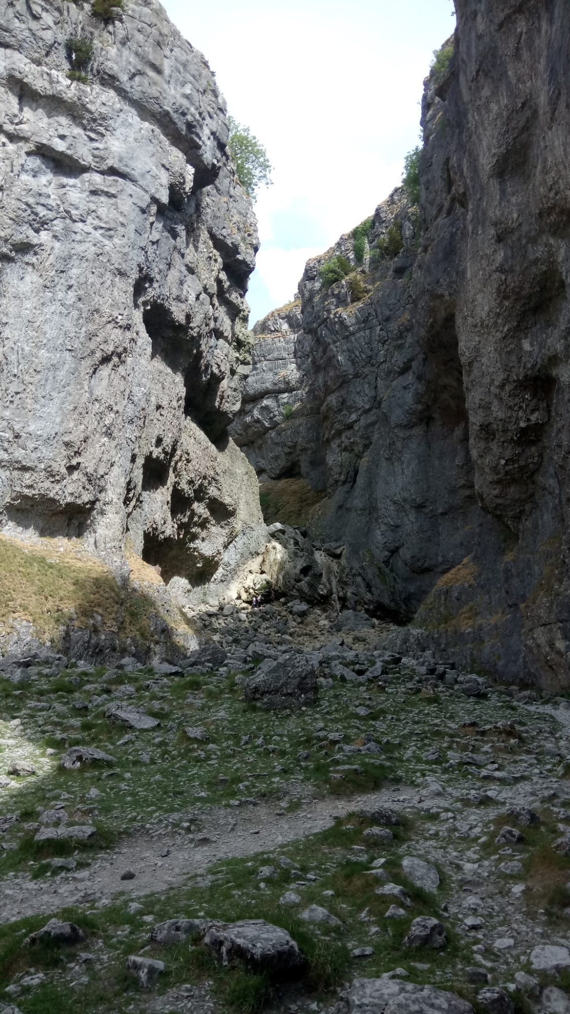 From Janet’s Foss, we went along the road a little and then up the path towards Gordale Scar. Passing the campers we went up the narrowing valley. Even this bit was dramatic. The sides of the valley were gradually getting steeper. It’s only when we turned the corner at the top of the valley that we got the full effect, with the valley walls becoming vertical and even overhanging the valley floor. There was also a welcome bit of shade here.