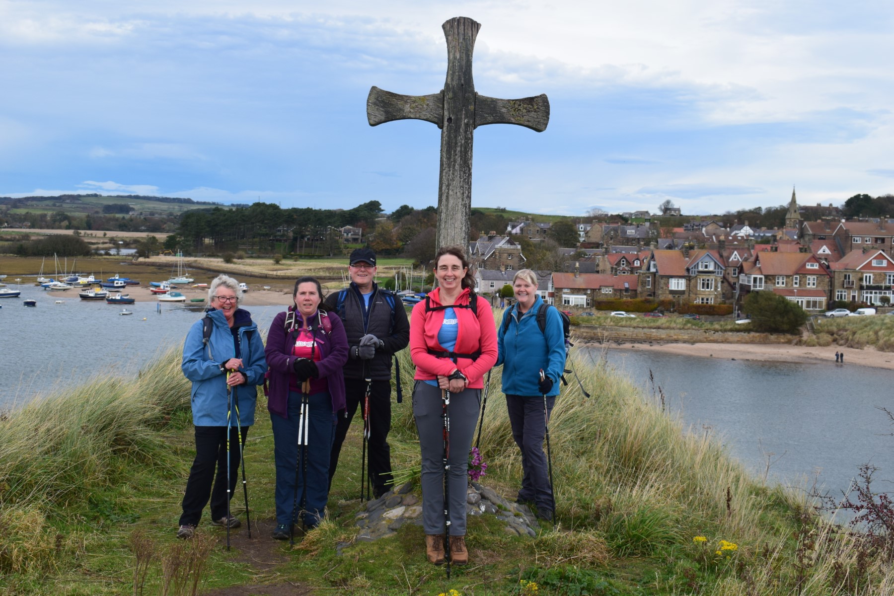 Dropping down onto the beach again, we reached the mouth of the river Aln, separating us from Alnmouth. From here, we walked up a small hill to reach St Cuthbert’s Cross. This location is allegedly where St Cuthbert agreed to become Bishop of Lindisfarne when petitioned by the King. The view from the top is spectacular, and Chris, who hadn’t seen it before, exclaimed “Wow”.